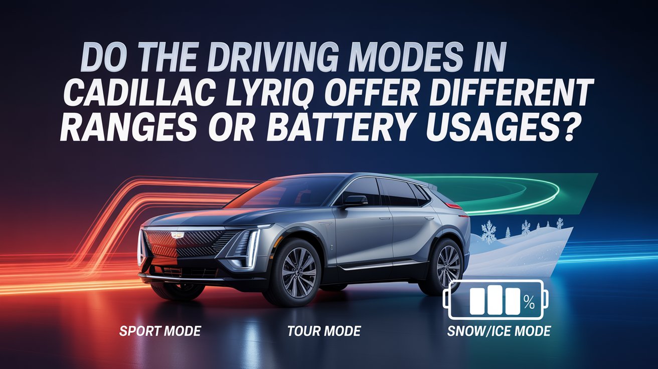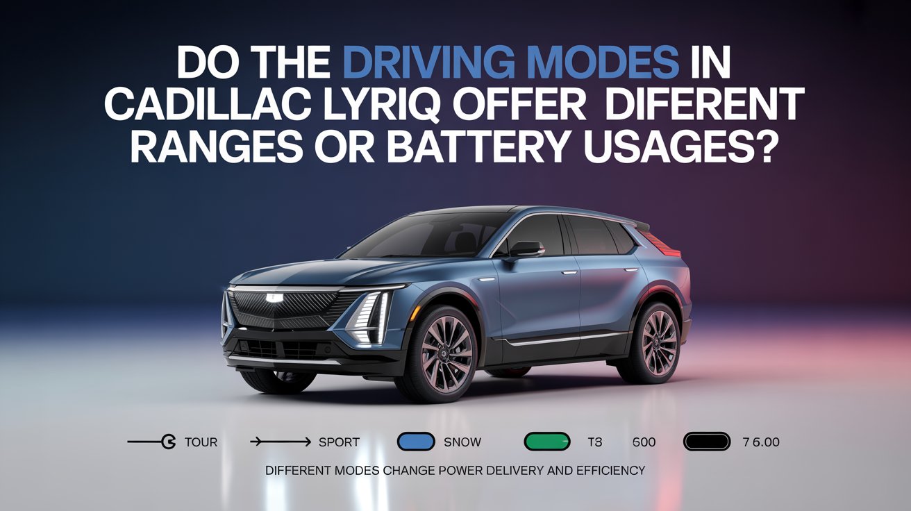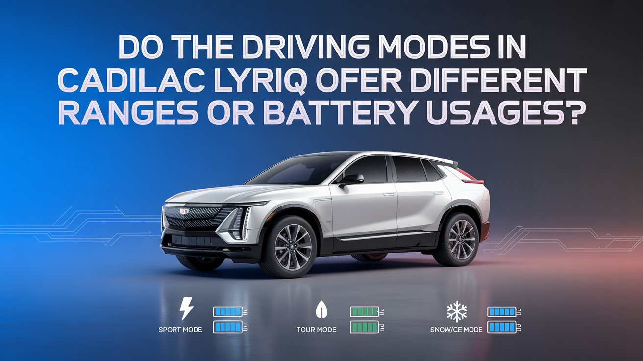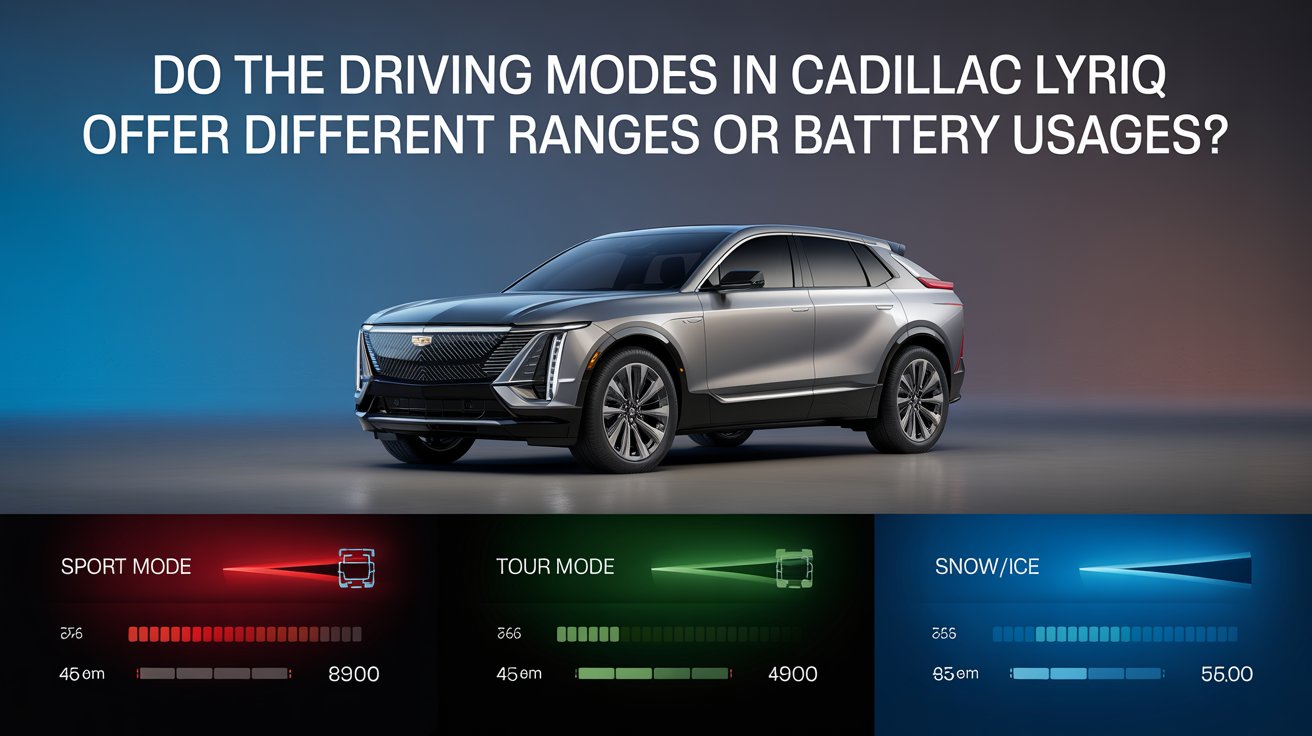 The driving modes in the Cadillac Lyriq can affect how the vehicle uses energy. Different modes change power delivery, throttle response, and regenerative braking, which may slightly influence battery usage and driving range.